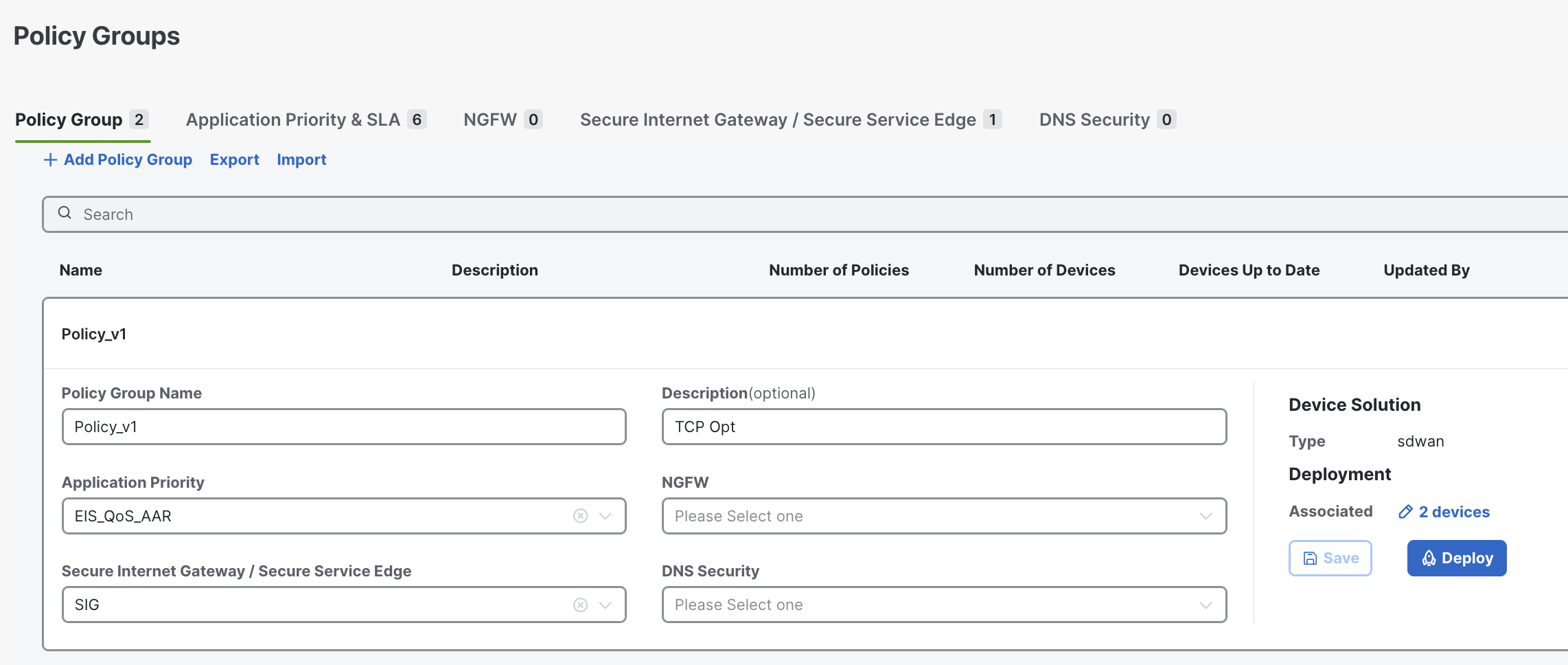 After creation, a Policy Group can be associated with one or more sites or devices (that are managed under a Configuration Group) and then deployed.