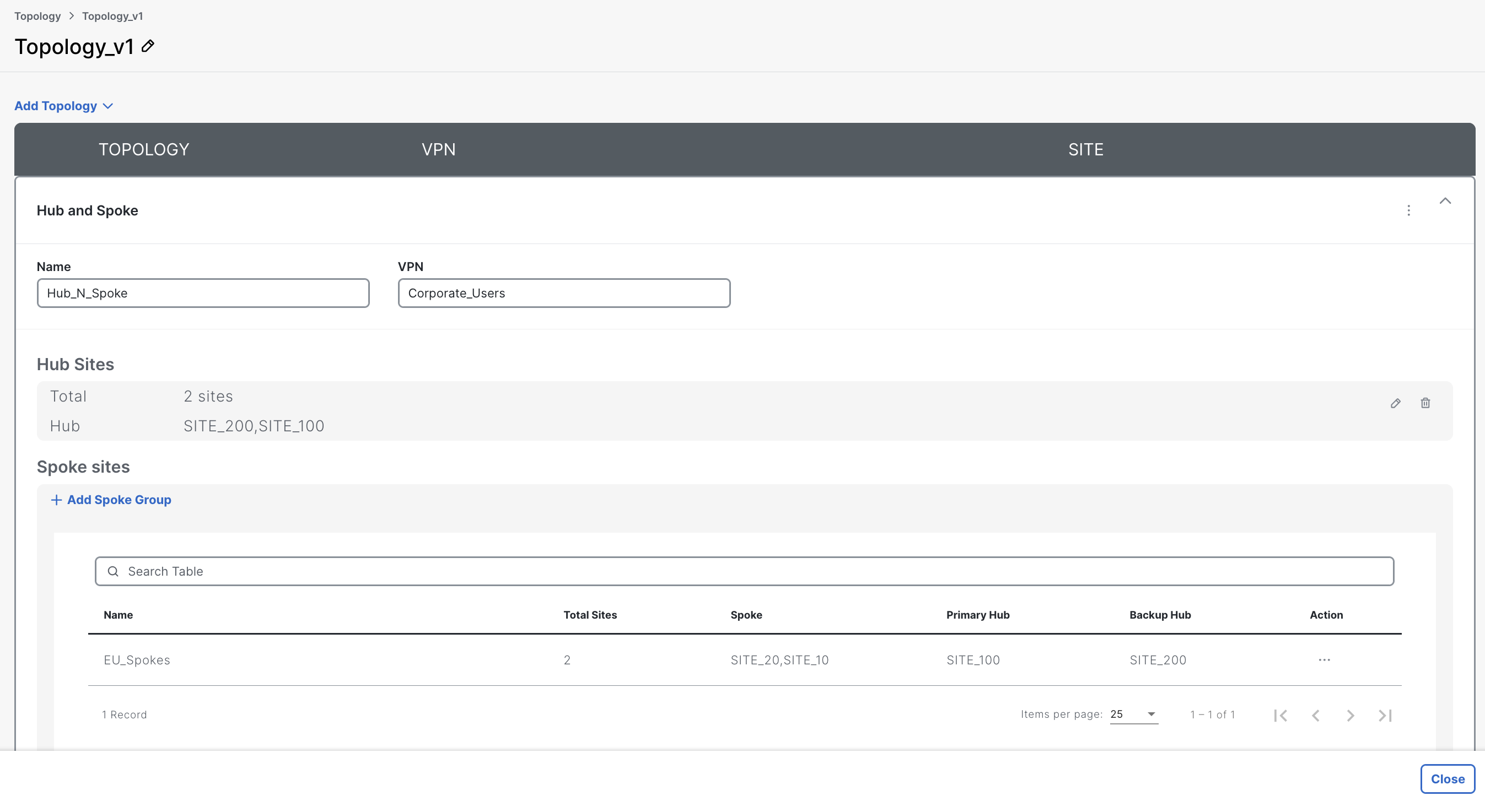 UX 2.0 includes a Topology policy where you can define the overlay structure. When you create a Topology Policy, you choose the topology type (mesh, hub-spoke, custom), select the relevant VPN(s), and assign sites (hub, spokes) or site lists.